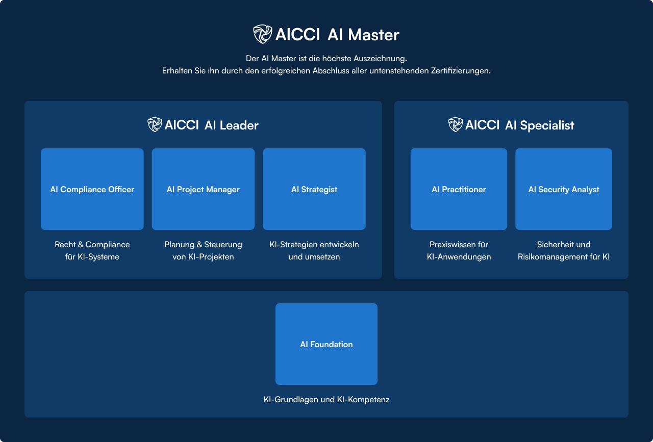 Mit unseren Zertifizierungen weisen Sie Ihre KI-Kompetenzen offiziell nach, unter anderem in Bezug auf den EU AI Act, und schaffen so die Grundlage für neue berufliche Möglichkeiten. Ob zur Sicherung der Zukunftsfähigkeit Ihres Unternehmens oder für Ihre persönliche Weiterentwicklung, wir bereiten Sie optimal darauf vor.
